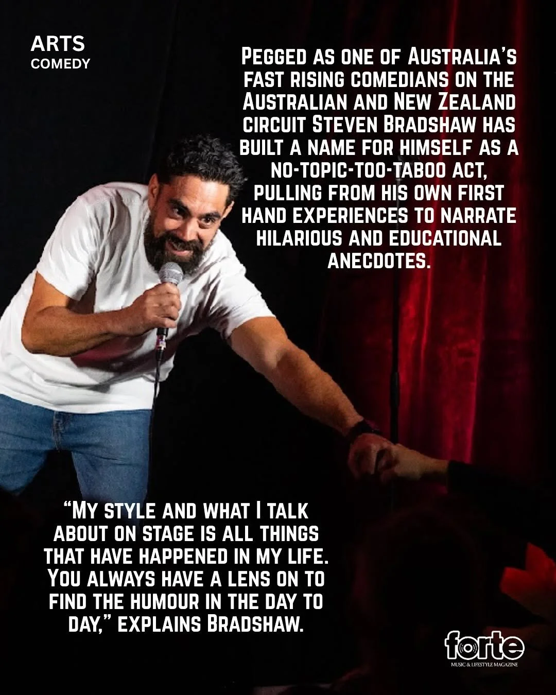 Steven Bradshaw performs stand-up across Australia and New Zealand. Born in Melbourne with a background from the Cook Islands, Steven’s unique perspective is both hilarious and educational. He performs most nights of the week across Melbourne. HE has been recognised as one of the fastest up-and-coming comedians in Australia, headlining shows and supporting the likes of Dave Hughes, Jimeoin & Dane Simpson.